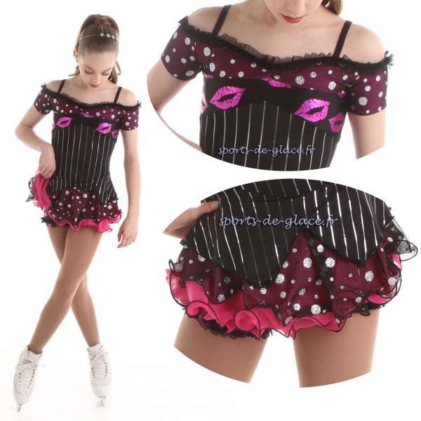 Competition dress for figure skating or dance, black and pink with kisses . Collection 'Groove'', designed by Josiane Lamond for Elite Xpression. Available in Size XS/S and S/M