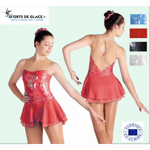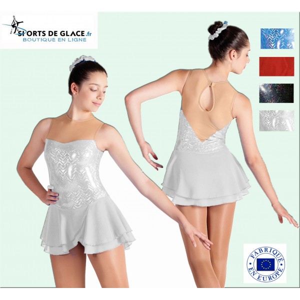 Lycra skating dress with mini holograms. Rhinestones on request (+14e). 4 colors, from size 12-14 to XL. Immediatly in stock in black&silver S, M, L XL// White 12-14 and blue S.