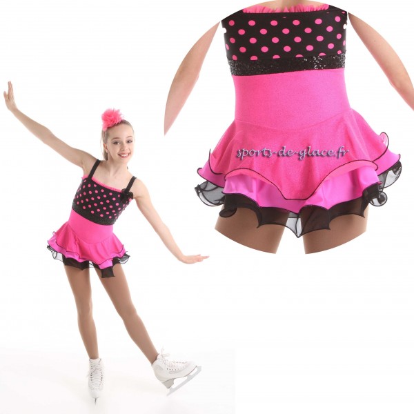 Tunique de compétition rose et noire à pois. Collection 'Groove', création J. Lamond. Disponible en 10 ans (=8-10) et 12 ans (=10-12)