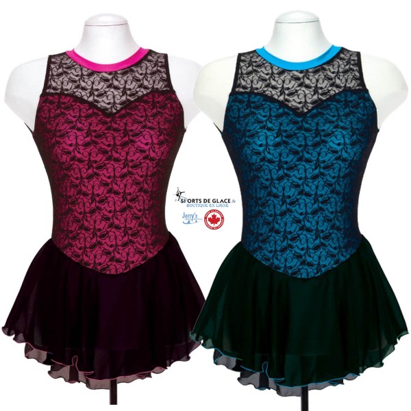 Tunique de patinage Jerry's. Dentelle noire et crepe georgette; buste et jupe de couleur rose ou bleu. Disponible en bleu 12-14 ans