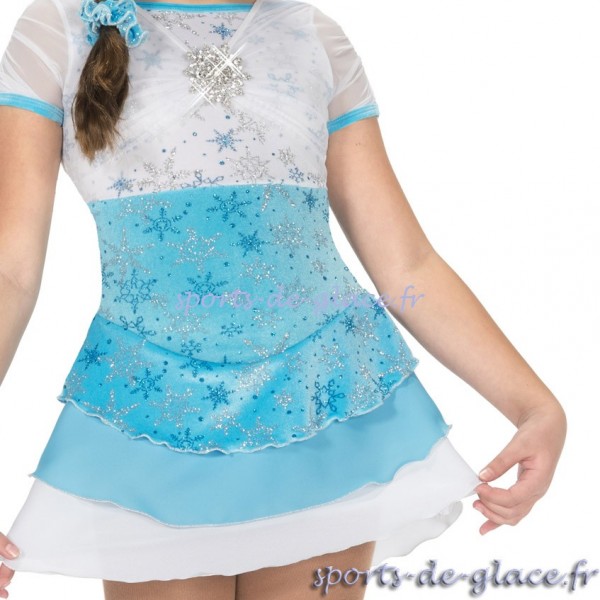 Robe de patinage artistique Jerry's Elsa, princesse Reine des neiges, velours pailletée, blanc et bleu. Disponible en 8/10.