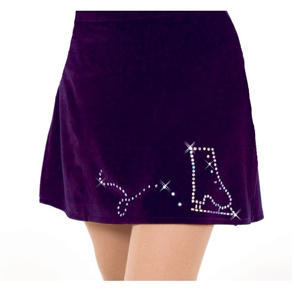 Jupe de patinage droite fendue en velours extensible avec dessin et patin incrustés en véritable crystal de swarovski, taille élastiquée, culotte en velours intégrée. Existe en violet ou en noir . Assortie à la veste référence 407. dernières pièces disponibles en 8/10 ans, 12/14 ans, S et M.
