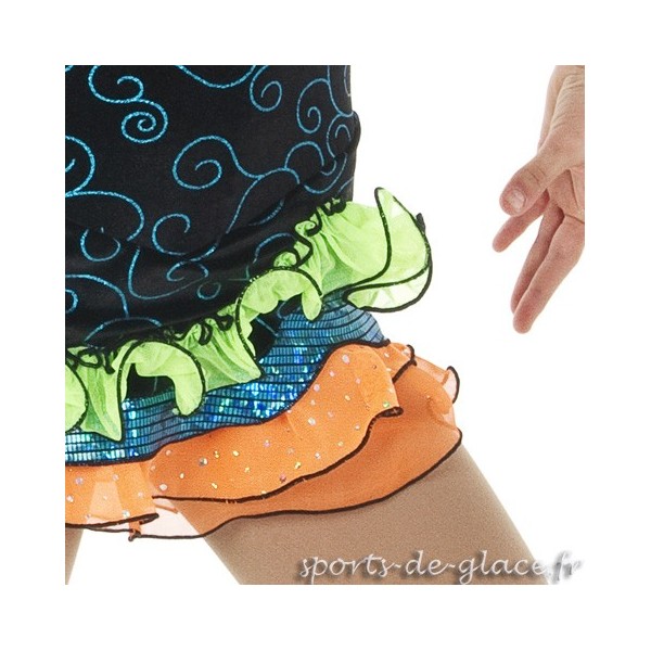 Tenue de compétition de patinage noire, vert pale, turquoise et orange. Création originale Josiane Lamond collection "Character ''. Disponible immédiatement en 6ans