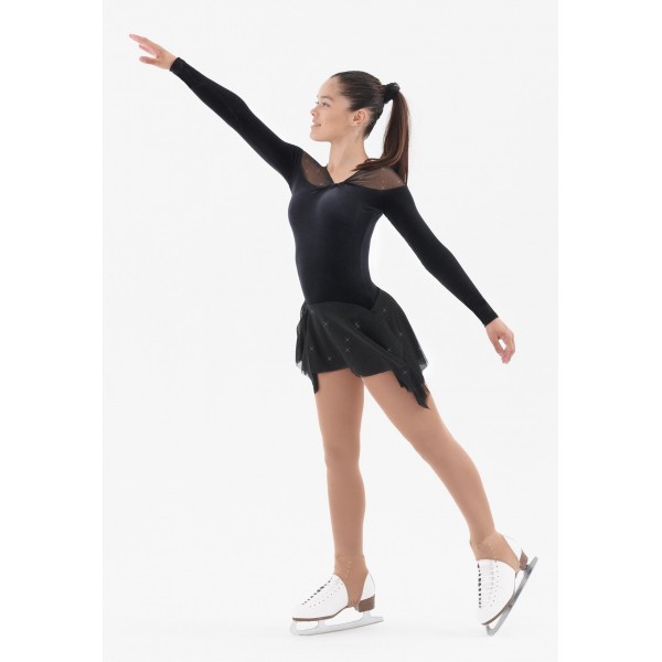 Buste et manches en velours, col et épaules en voile extensible pailleté. Jupe double volant asymétrique en mesh pailleté.Design et confection en Union Européenne.