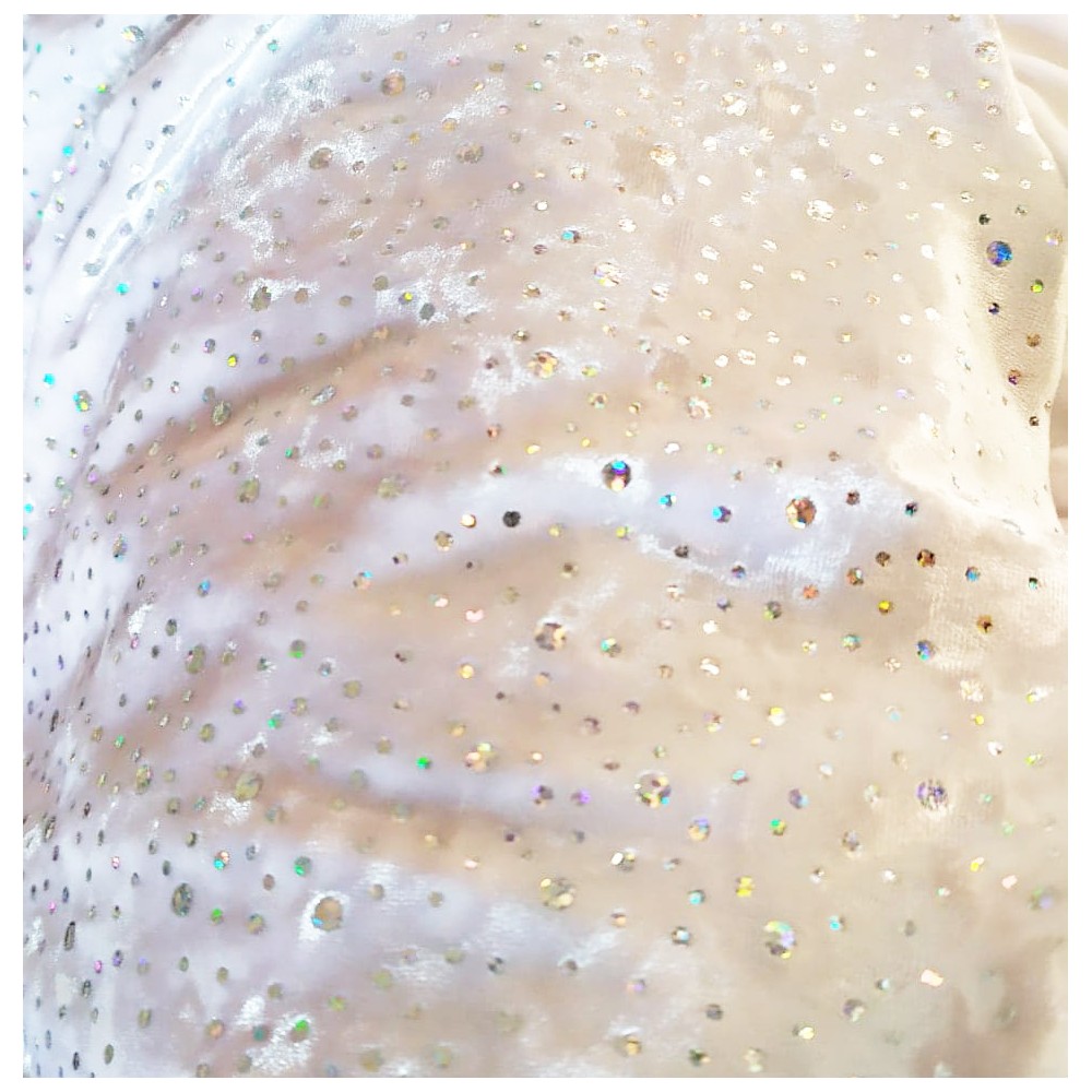 Tunique de patinage Elite blanche scintillante velours avec mini hologrammes et lycra mesh. Taille  M uniquement